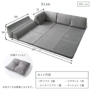 2Pソファ 2個、コーナーソファ 1個、ラグマット 1枚、クッション 5個